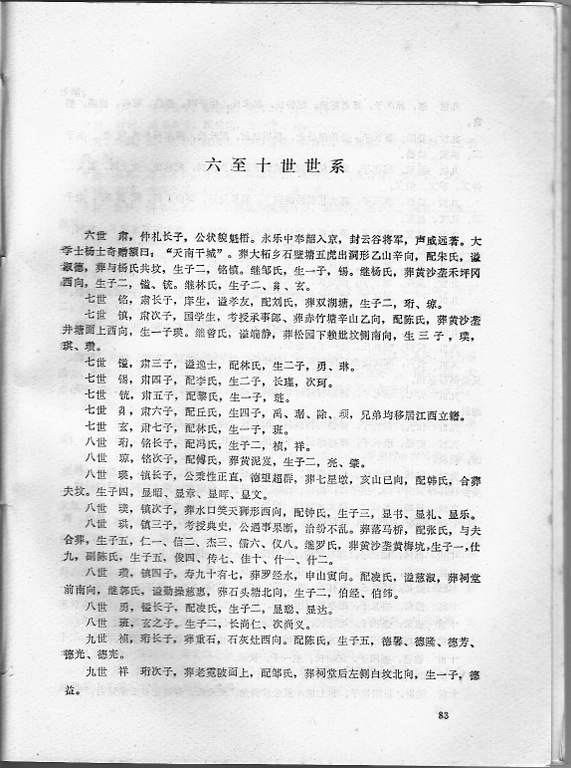 景清公以上至舜祖,一脉相承,使之能追根溯源,景清公以下,在梅州境内之祖德、祖龙、祖盛三大房分列世系。祖章一房,因不在梅州境内,故未续其世系,仍其旧谱。