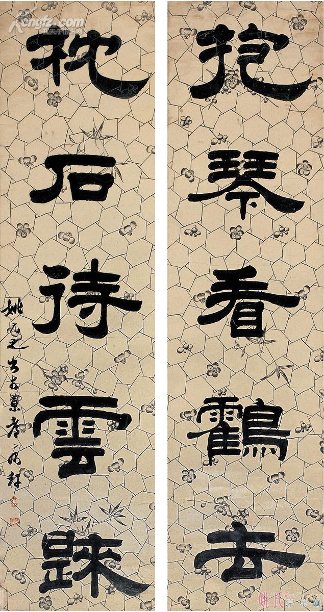 ! q) |2 F+ `: v4 t( k2 |9 E6 [) X- i5 l0 ]& J$ _ 钤印:钤印:元之(朱) 姚氏伯昂(朱) + z1 B& L, i2 N# X, T纸本蜡笺 对联 识文: 抱琴看鹤去,枕石待云归。 款识: 姚元之书于京都庽轩。 出版: 《 ...
