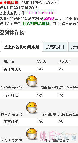 姚先登 发表于 2014-3-5 13:12 记得刚开始签到的时候好多宗亲都用激将法让我签个第一!我是真没有熬夜的习惯,否则第一不敢说经常拿,前三名没问题!我这三次前几名都有故事!第一次是大年三十,由于第一次抢第一没有经验,让奉初兄给抢去了;第二次是2月23日,哪天不知怎么搞的一觉睡到11点50就醒了,突然想到签个到吧,没想到就是第一!这第三次是因为晚上陪孩子学习,孩子在学习,我却睡着了,等醒来一看11点半了,刚好要到签到的时间,就打开电脑。。。。。。!这次奉初跟我几乎同时完成签到,我比他也就快几毫秒!哈哈! |